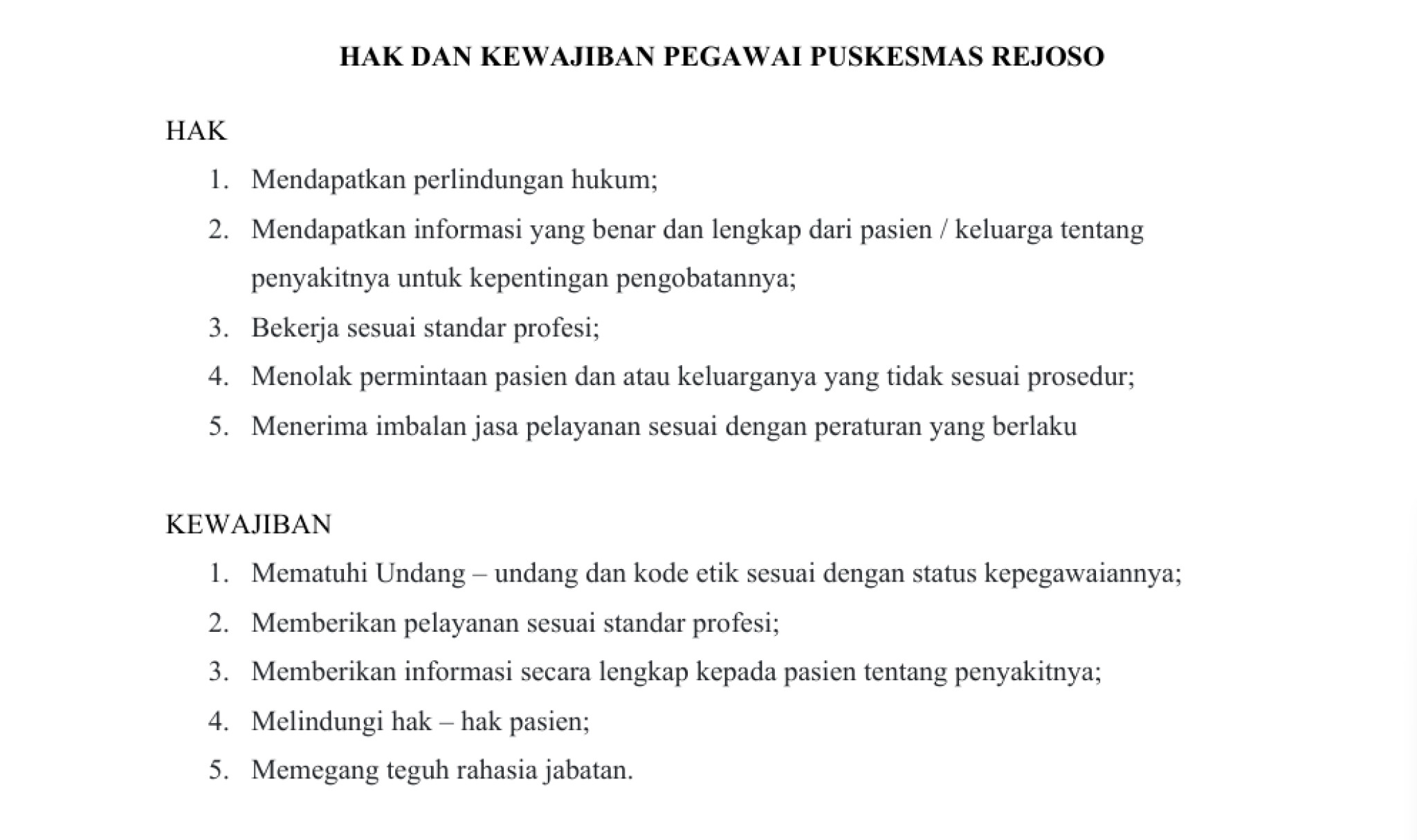 Hak Pegawai Puskesmas adalah hak-hak yang melekat pada diri mereka saat bekerja, seperti perlindungan hukum, standar profesi, dan imbalan jasa.Sementara untuk Kewajiban Pegawai adalah tugas-tugas yang harus dilaksanakan seperti memberikan pelayanan sesuai standar, mematuhi peraturan, serta menjaga kerahasiaan data pasien.